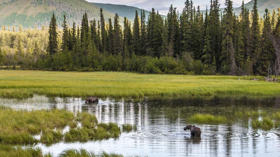 In summer, moose prefer swampy areas, such as ponds, sloughs, muskeg, creeks and rivers, where they feed on shrubs and aquatic plants and they’re most active in the evening. They are known to forage all over town, or in the wetlands of Creamer's Field Migratory Waterfowl Refuge. Another great place to spot moose is on Chena Hot Springs road, especially within the Chena River State Recreation Area.